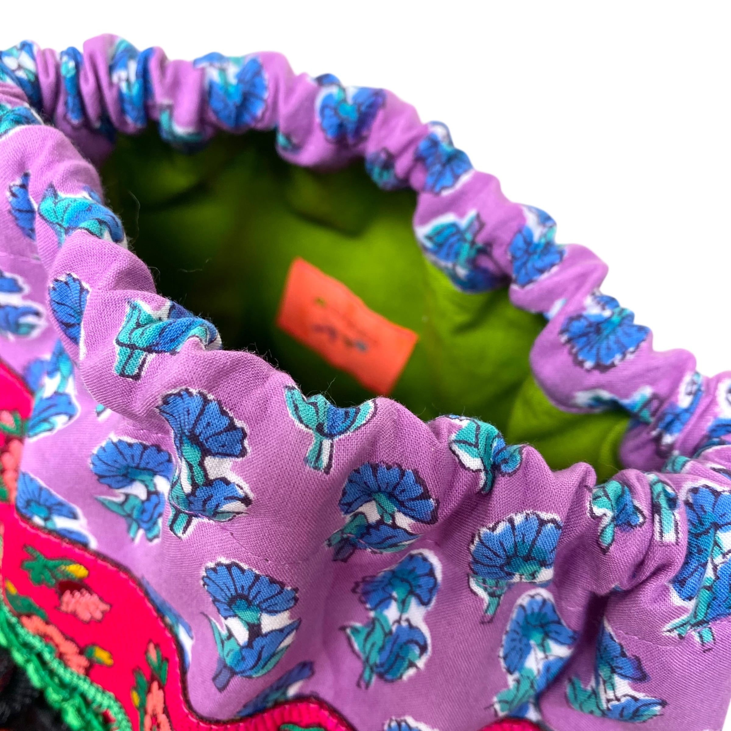 ブロックプリント生地にフリンジ、レースと刺繍リボンを合わせました♩